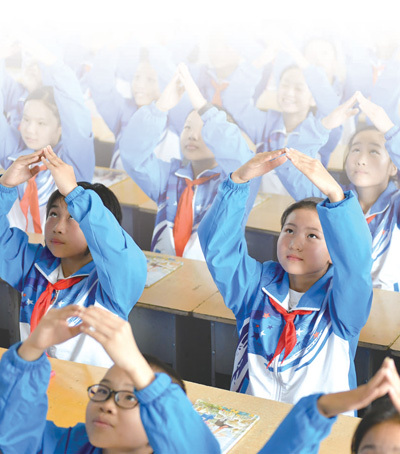 金寨县希望小学的孩子们做手语操。程兆摄